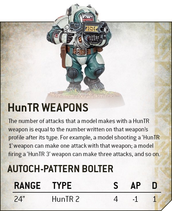 All good dwarves understand that slow and steady wins the race, and the Steady Advance rule lets the Votann live that value. This, once again, appears on every unit and allows them to ignore modifiers to their movement characteristics and any modifiers to Advance/Charge rolls. Speaking of Advance rolls, all Votann units advance a fixed distance rather than rolling for it, 3” for most things, and 6” for anything with the Accelerated keyword (Vehicles, Bikes and the Einhyr Champion, who is a rocket powered turbo dwarf). This cuts both ways - on the Accelerated stuff it’s very good, as their base move characteristics aren’t particularly lower than anything else, but for infantry it caps their reach significantly. One particularly notable impact is on the ability to reach objectives on turn one - on quite a few Matched Play maps, there are objectives 12” from deployment zones, which means you need just under 9” of distance to reach their radius straight away. Vehicles and bikes are thus going to be key for making sure you can grab these, which isn’t exactly a problem given how great they are, but is worth bearing in mind.HunTR Weapons