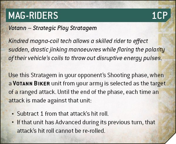 Source: Warhammer CommunityBikers also get some other neat tricks, being able to switch on -1 to hit and (if they advanced) prevent hit re-rolls for shooting against them with Mag-Riders and head off the board into Strategic Reserves with Outflanking Pioneers. The former seems very useful in a pinch - the bikes are ObSec, so if you need a point and the opponent doesn’t have nearby melee, Advance them onto there and spend 1CP to demand a massive amount of firepower be thrown at shifting them. They can also go really fast to do this if you want, as there’s the Accelerated Response stratagem to allow an ACCELERATED unit to auto-advance 12”. Useful on the bikes, very funny on the Land Fortress or a rocket-powered turbo dwarf (the Einhyr Champion).