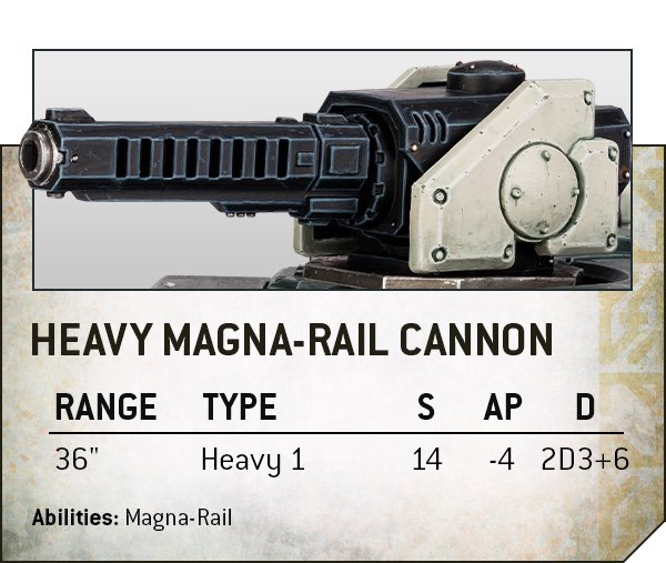 Source: Warhammer CommunityThe main gun is where things go wild though, and realistically you’re picking either the heavy magna-rail cannon or the heavy Conversion Beamer (with the final ion option just adding lots more AP-2 D2 shots, fine but you already have plenty). The heavy magna-rail is equivalent to a railgun - it strikes for 6+2d3 damage at S14 AP-4, and because it’s a magna-rail weapon it ignores invulns, and can inflict spillover damage on smaller targets on a 6 to wound (which, you know, sometimes means 4+ to hit). The mix of being able to reliably make something big die hard and sweep through elite infantry is gold. Despite that though, the heavy conversion beamer is also tempting, especially if you’re building a full-blown mean beam machine to use with strats. It’s two shots, and has the rule where these double outside 15”, and strikes at a pleasing S8 AP-3 D4. If you can line this up to lance through multiple units then that’s some serious killing, and it’s easily the best place to drop the Ymyr beam stratagem, potentially punching four Mortal Wounds through multiple targets at once.