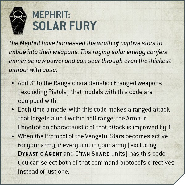 - Protocol of the Vengeful Stars: Additional -1AP on 6s to wound when shooting OR ignore Light Cover within half range. Favoured by Mephrit, surprising no one who's familiar with them.