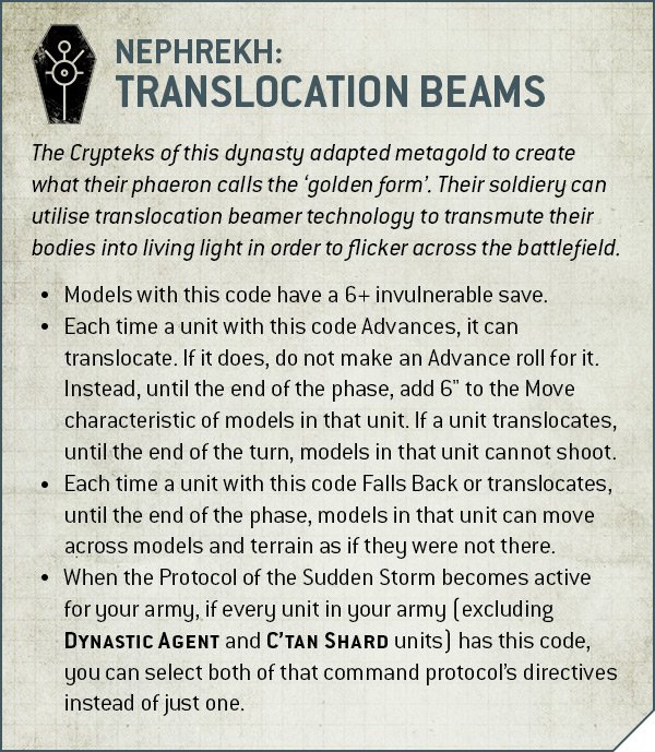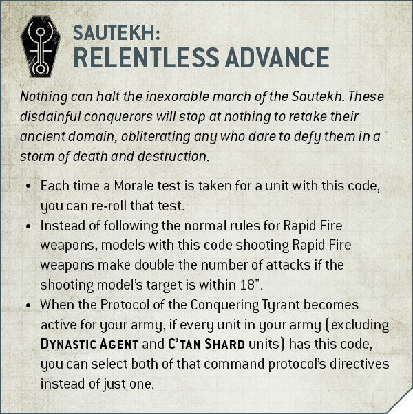 - Protocol of the Conquering Tyrant: Add 3" to aura abilities and a selection of targeted buffs OR fall back and shoot at -1. Favoured by the Sautekh.