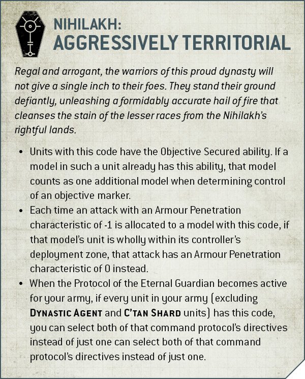 - Protocol of the Eternal Guardian: EIther be in Light Cover in the open if you haven't made a Normal Move, Advance or Fall Back in this battle round, OR effectively count as being in defensible terrain. Notably, because the move check is on a battle round basis, the first effect will almost always be "on" if you went second in the game, whenever you chose to activate it. Favoured by the Nihilakh dynasty