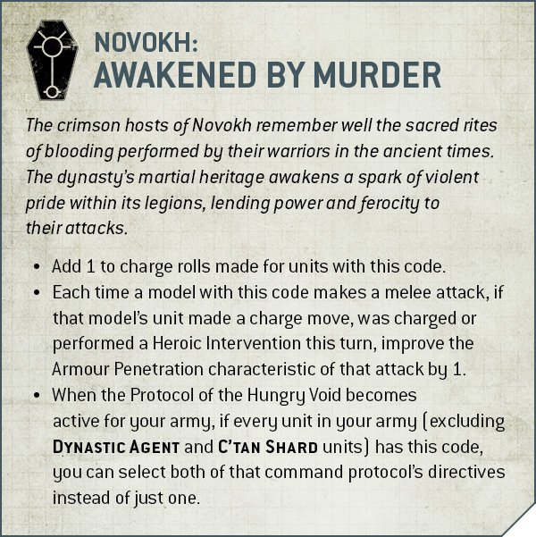 - Protocol of the Hungry Void: Additional -1AP on 6s to wound when fighting OR +1S in the first round of combat. Favoured by Novokh.