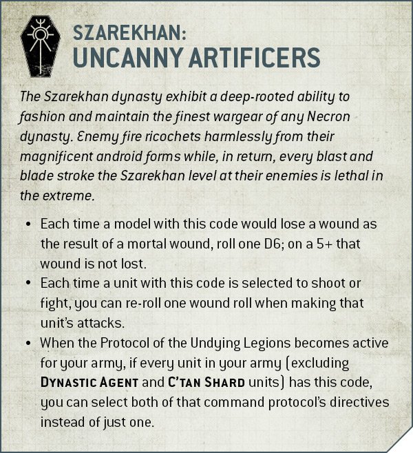 - Protocol of the Undying Legions: Gain 1 extra wound from Living Metal OR re-roll 1 dice each time reanimation activates. Favoured by the Szarekhan.