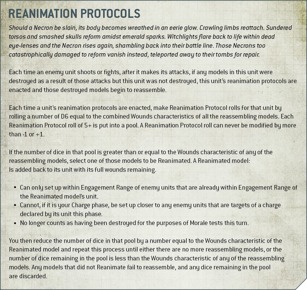 - Reanimation Protocols: A chance for models to get back up after they die, appearing on all multi-model units, even Canoptek units that missed out before.