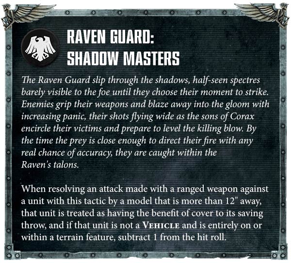 That's changed, and you can now get access to 95% of what's in this book if you are a Raven Guard successor chapter. We broke those rules down in part 1 of our main book review, and importantly "successor chapters" in this case includes those using the "build your own" traits. If you're going down-the-line Raven Guard, this is the tactic you get: