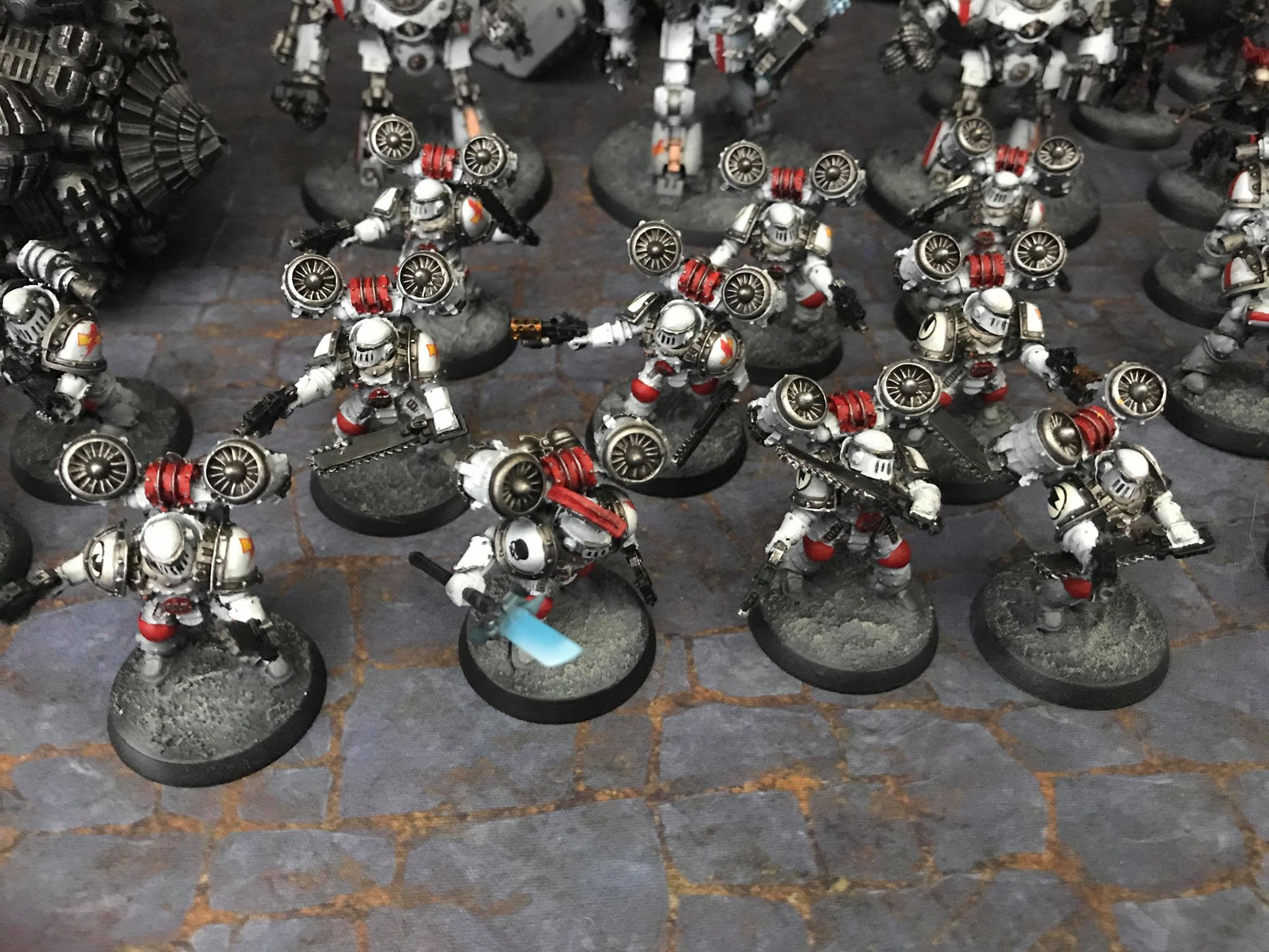 Blood Angels Reivers. There's white on them, ok? Not many people have White Scars armies that they've sent us pictures of. Credit: Jack HunterMy basic take on this army is that you probably want one big unit with high volume attacks that deep strikes in on turn 3 and trashes stuff. Grav-chute knife Reivers can't quite flatten anything like the clawminators can, but they'll put a hurting on plenty of stuff, once again especially if you get either/both of Kor'sarro and the banner near them. At 180pts for the full unit, it's a much more modest investment that the Terminators are, so if you weigh it up and believe that having more access to other stuff will compensate for a less brutal big hit then go for it. Against anything smaller than a Knight they'll still put in plenty of work, but be duly warned that they're a lot less good against anything that's actually got T8.