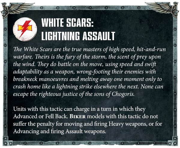 The White Scars chapter tactic is, if we're honest, a 7/10 at best - being able to charge after falling back or advancing is very nice for a melee-focused army but the BIKER half of the ability is very weak, as there just aren't that many Assault or Heavy Weapons on anything that isn't Attack Bikes to make it worthwhile. You can't get "advance and charge" as an ability from the mix and match list, but as we'll discuss later on which other things you might want.
