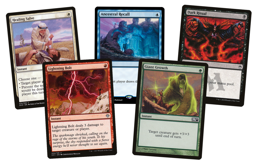 You can see this in the basic relationship of cards in the game's original Alpha/Beta sets. Early Magic established a number of common ratios, some of which still hold up today, such as the conversion rate of 2 generic to 1 colored mana or the raw 1+x trade of mana for damage in Fireball, Disintegrate, Earthquake, Drain Life, or Hurricane, and some of which do not hold up so well, like the 0-for-1 tradeoffs of the Moxes or the 1-for-3 tradeoffs of Ancestral Recall or Dark Ritual. Early Magic introduced a number of cards which made one-for-many trades possible, such as the aforementioned Earthquake and Hurricane, Balance, and Wrath of God; theoretically these cards avoid creating blowouts by affecting "all" of a thing, and thus hurting both players equally. But players quickly learned that with proper timing and building these effects can break the standard ratios wide open, letting a player reset the board and generate significant advantage off a single card.