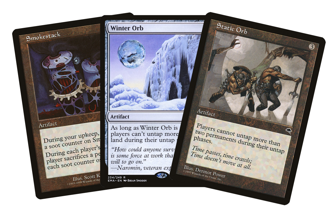 One of the best things about Stax effects is that there are a large number of key Stax cards that are artifacts, and can be put into any color deck. We've already mentioned Smokestacks, Static Orb, and Winter Orb but Lodestone Golem, Sphere of Resistance, Trinisphere, and Tanglewire all fall into this category as well. These can also combine with each other - Tanglewire can be used in concert with other cards to effectively grind the game to a halt for a few turns. This is because of how upkeep triggers work; tangle wire will come into play and force each of your opponents to tap 4 permanents on their turn. On your turn you put the tap effect on the stack then the fading effect. Remove a counter, then you’ll only have to tap three permanents, because by the time the effect resolves only two three counters remain, but Tangle wire is itself a permanent, so you can tap it. Effectively you tap 2 permanents, and your opponents tap 4 each, 2 for 12.