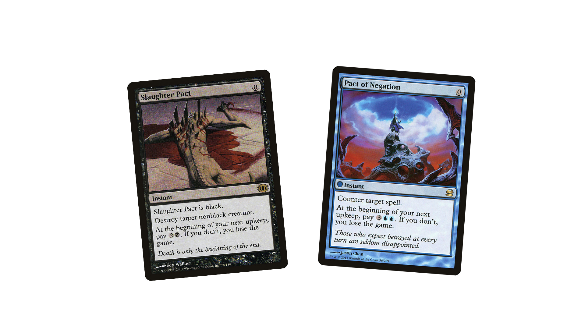 Pacts were first introduced in Future Sight as a way to model a mechanic based around borrowing from your future self. They cost 0 mana but require you pay their cost at the beginning of your next upkeep or you'll lose the game.