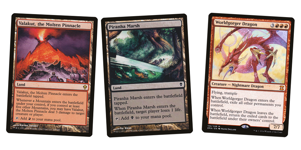 Credit: Wizards of the CoastGolos fetches lands, so one potential win con is a land based one. For fun, I made a high powered gate deck, but gates aren’t really competitive. There are some lands that can kill people, among them Valakut and Piranha marsh, by repeatedly entering and leaving the board, typically via Worldgorger Dragon / Animate Dead lines. We could use Golos to fetch one of these lands and assemble the combo, or run it as a backup combo. But because of the triggering of Worldgorger dragon, if someone destroys the dragon while it’s enters play effect is on the stack, we lose all our permanents. Risky.