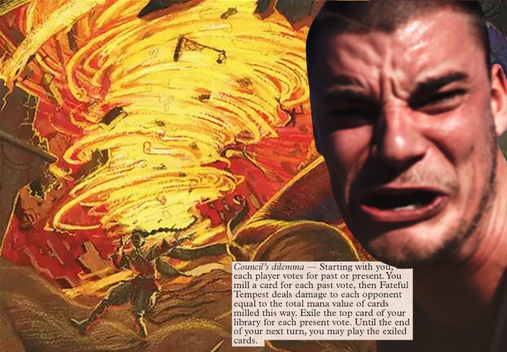 We do need to get cards into the Graveyard before we get them exiled, shuffled, and more however, and Red isn't exactly known for self-mill. While your ideal minimum is 4 cards in, 4 cards out (per turn cycle), we'd in an ideal world want even more because there's some cards that aren't meant to just be tossed away. Things like Anger, Shenanigans, or Faithless Looting all have reasons to remain in the yard, so between casting spells and churning through our Library, I'd like to mark an ambitious 6 cards per turn cycle to enter our Graveyard. Let's talk about meeting that benchmark. There's a bit of a subtheme of 1-mana Artifacts in this list, given so many of the Limited-intended grave hate costs that much, and Shriekhorn follows suit. Those cards can be found via Tezzeret, Cruel Captain, and once we're done, deposited into the yard via Goblin Engineer & Goblin Welder. Tezzy can even untap them, and while we could play more tap-to-mill pieces, like Throne of the Grim Captain, alongside untappers like Voltaic Key, they missed the final cut due to a lack of impact. The one which has remained is Perpetual Timepiece, primarily because even while tapped, it offers a Gau trigger for 2 mana. Beyond that though, let's once again look to our Lands: Valakut Exploration doesn't read as a mill piece, but it's at minimum one extra card per turn, and those we don't play go to the yard and result in damage. If we have a Fetchland, not only does it go to the yard when searching for a Mountain, but that's an extra card for what is functionally free.There's a few instances of one-time mill which also see a slot here, and the best example is Book Burning. Book Burning requires a bit of political finesse, but so long as you're guaranteeing the person who takes damage from it will be aggro-ed down by you until death, players won't raise their hand so easily. 2 mana for 6 cards is a steal though, as loading the yard isn't always free in our color. On a similarly political note, there's Fateful Tempest, which either translates into a ton of advantage, or mill+damage. Much like Book Burning, the ideal here is all mill, assisting in our fueling of the yard and supplementing Gau's group slug. On the topic of cards from the new set, though...
