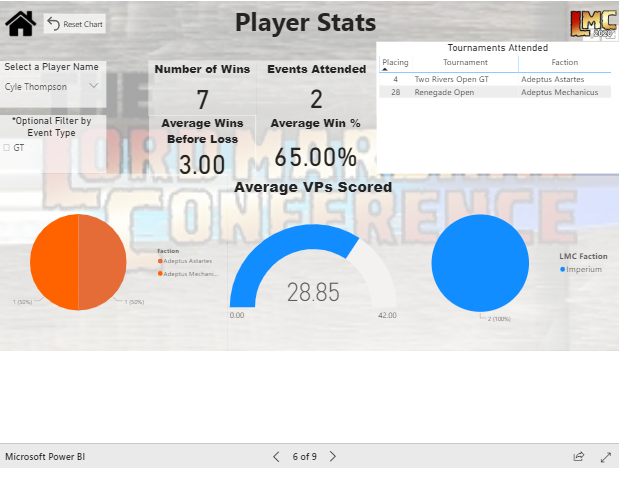 Faction Drill-downThe Player Breakdown is a really cool addition to the standard data tracking. It lets you go a level deeper and see how players themselves are performing on a game-by-game basis throughout the course of the season. It provides both the overall performance as well as event performance and let's you really Facebook stalk someone but in a less weird and more cool and good way. It allows you filter for RTT and GT so you can separate out some of the local meta vs LMC meta and really gives you that look at a player's skill by identifying their average first round loss. I love this addition. The only thing I think it's missing, similar to the faction analysis, is a average VP/round against for similar reasons.