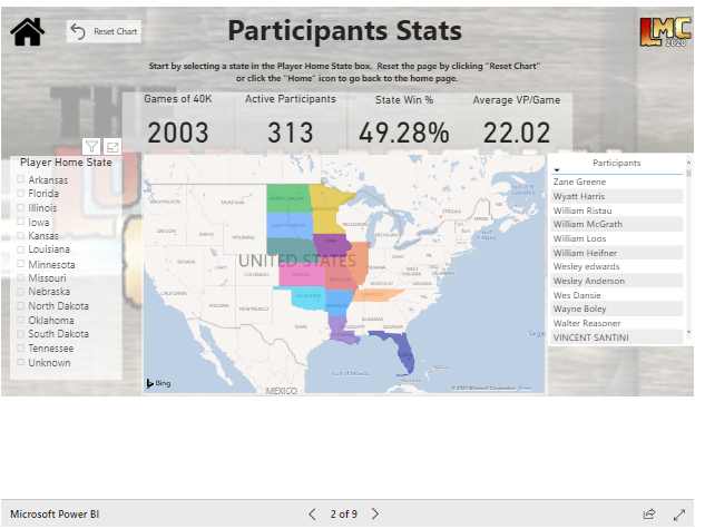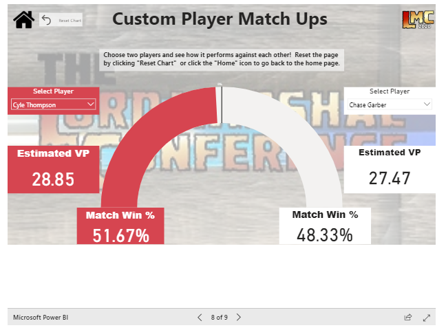 The first stats page is a player by state breakout of everyone registered to an event within the conference. You can sift through these by state and highlight specific players to identify selected stats about them including their number of games, win rate, and VP scored on average.