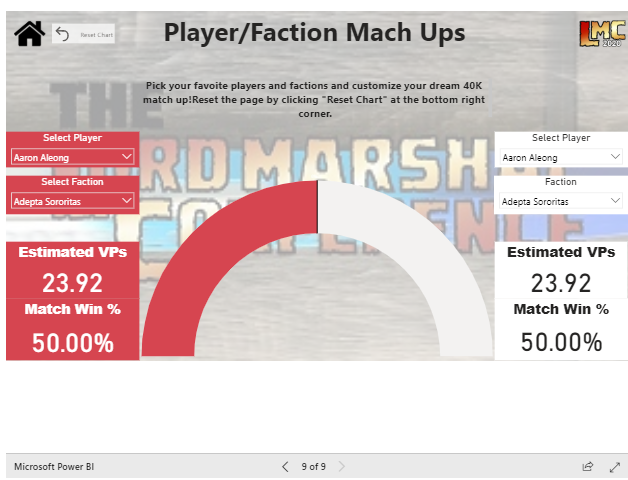 Player/Faction v Player/FactionThis is more of a fun addition this point due to data limitations - however, as the season (and years) go on and more data is entered, the tool will be a better representation of what may truly be possible in pairings. I foresee this being a fun addition for players and TO's at events to use as a yardstick and most importantly, to smack talk.