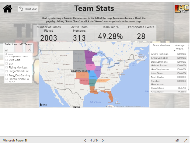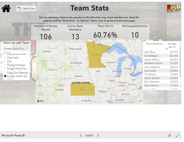 Event Drill-downThe Team Overview page features the similar national breakouts but then lets you zone in on specific teams, their membership, location, performance as a team and individually, and their general activity level within the conference. I really like this feature as it helps to push that cross-team performance rivalry and, perhaps more importantly, gives you the option to back up your intra-team shit talk with data. A nice future addition might be the capability to compare team vs team in a sort of Big Ten vs ACC challenge type of scenario. A data-backed Frozen North Gaming vs Warhogs annual challenge would be an addition to this community that no one is truly asking for and yet, may just be magical.
