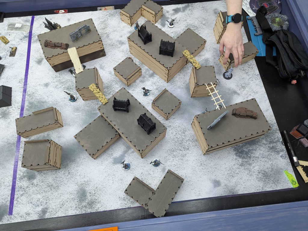 Ryan: I second the above, especially the calmly worded note on the bottom. We are working within the time constraints to be able to both design an awesome and competitive experience while also being able to produce some really awesome tables. After getting the layout in a place where we felt more happy with it, we presented it to Sammie and Zack at FF to brainstorm ways to make the elements on the map look exciting and have some more narrative pull. This would mean the taller squares would look like watch towers, big blocks could be bunkers, etc etc. As much as I would feel at home with the boards looking like a paintball field, Trench Crusade is definitely not the place for it. We want passers by at Adepticon and any event to be enamored and interested in the game at a first glance by a table being played on.