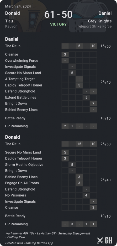 The name says it all really - one last outing for the CIB Crisis block, may we never see a shooting unit quite so horrific ever again. Aun'va as the ultimate Lone Op and a solo utility Crisis Commander also get a fitting sendoff. Luckily there's still plenty of stuff in support here that will remain great with the new book, and I expect to see Mont'ka powered Broadsides, Riptides and Breacherfish rampaging around in the near future. The list also showcases another big T'au asset, which is that they have phenomenal board coverage. Donald sent me the scorecard from his final game, and on The Ritual he was able to outscore Grey knights despite barely killing anything, simply by carpeting the board in so many units that they couldn't get a foothold. Expect that go-wide plan to remain extremely strong going forward, and well done to Donald on providing a big showcase for the Index as was.