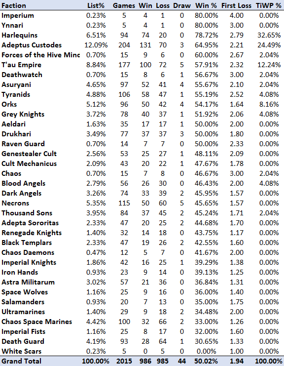 still really high, and just a hair under a 65% win rate. To restate this point, in a normal game, this would be an oppressive faction in need of immediate and fairly drastic nerfs. Now look at how far behind Harlequins they are, and despair.