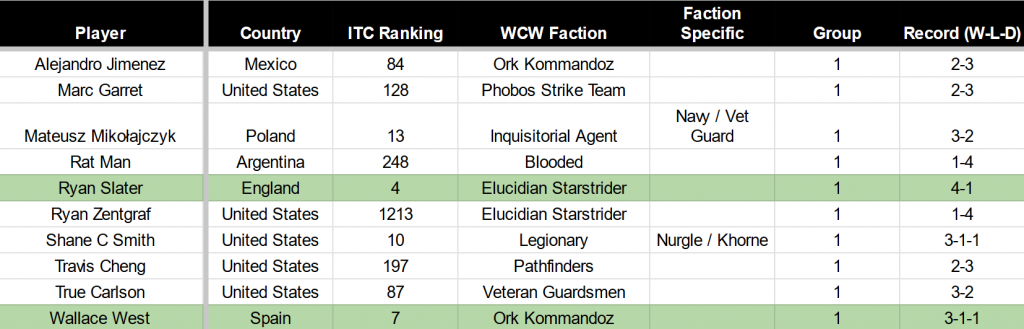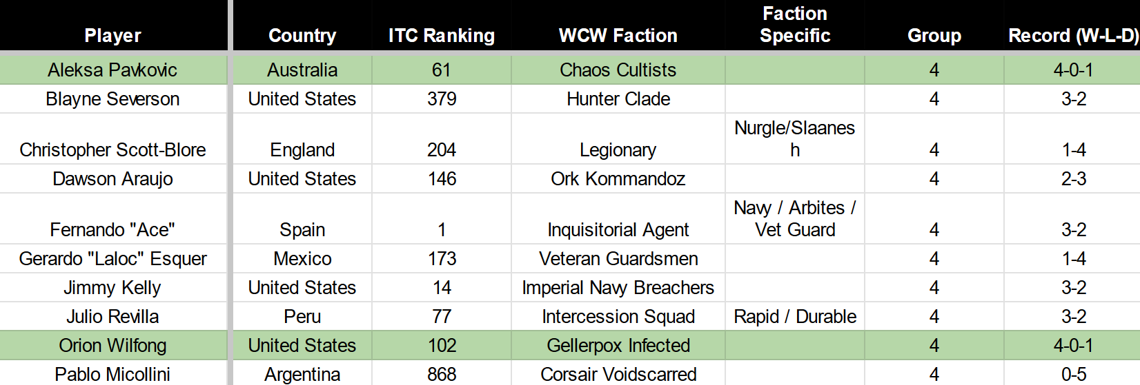 TC- “This group sees some obvious favorites, with both worldwide #1 Ace, and last year's finale winner Orion. Orion’s favorite Gellerpox have seen a bevy of nerfs but he’s still one of the best to play the team…This group notably avoids the multiple Ork players of groups 1-3, and sees a very healthy spread of team choices. It's honestly anyone’s game, but we at Goonhammer expect Ace to make it out.”