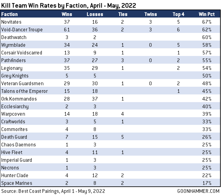 That said, neither team feels completely oppressive right now - a trio of results in relatively small fields does not a bogeyman make, and until we see more to suggest that Novitates are an issue, the Kill Team meta feels fairly healthy right now - though the caveat here is that they're currently holding a 67% win percentage for April - more on that below. Specifically, Novitates, Void-Dancers, Voidscarred, Wrymblade, Warpcoven, Legionary, Pathfinder, and Veteran Guardsmen teams all seem pretty competitive, while Grey Knights and Talons of the Emperor teams seem to have some outside play. That's a solid list, though Warpcoven have fallen pretty far from the spots they occupied at the start of the year.