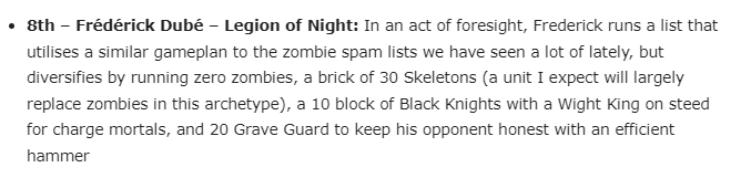 - 4th - Zach Smith - Legion of Night: The Mannfred + Morbheg's Claw style list has adapted to summonable units getting significant hikes by stripping this element back to mostly pivot around one unit of 30 Deathrattle Skeletons and using all those points left over to bring a VLoZD & a Terrorgheist - when in doubt, Herohammer it out