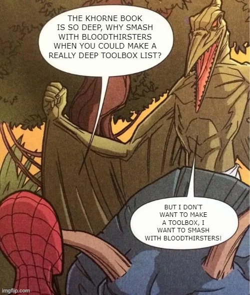 Okay I should probably actually talk about the showdown matchup itself. The reason the BT list won likely has a lot to do with how the mirror match plays out - when both armies have the same movement tools and shenanigans, the Bloodlords ability for better mortals on the charge is somewhat nullified when Thomas could tie them up with Bloodbind, Murderlust or an end of turn charge from his Bloodthirster. Not to mention, Skarbrand and the Insensate Rage BT can really pop off if any 6s to hit are rolled, and the WOK BT can even let two of the Bloodthirsters fight in one activation (with Halo of Blood meaning two Strikes-first BT on your opponent's turn if they're engaged in combat), meaning ultimately it's bad news in a squishy melee mirror for the guy without the big aoe mortal wound Bloodthirster and luck on his side.Anyway, the list is fun as hell and doesn't care about things like 'consistent damage output' and 'low variance' that's afforded by hammers that throw a lot of dice and have a dependable statline like 3s/3s/-1/1. It wants to throw a few dice and have that Insensate Rage Bloodthirster blow up an entire castle if it gets lucky on those 5 attack dice.