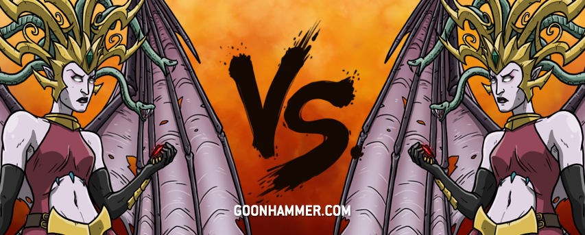 It's a bona fide Khainite Civil War! Morathi with her Spear Snakes and Khinerais, and Krethusa with her Witch Aelves and Shrines.Krethusa has the advantage of numbers, both the number of witch aelves and their recursion, while Morathi isn't too far behind with her more combat capable Blood Sisters and of course the Shadow Queen herself.