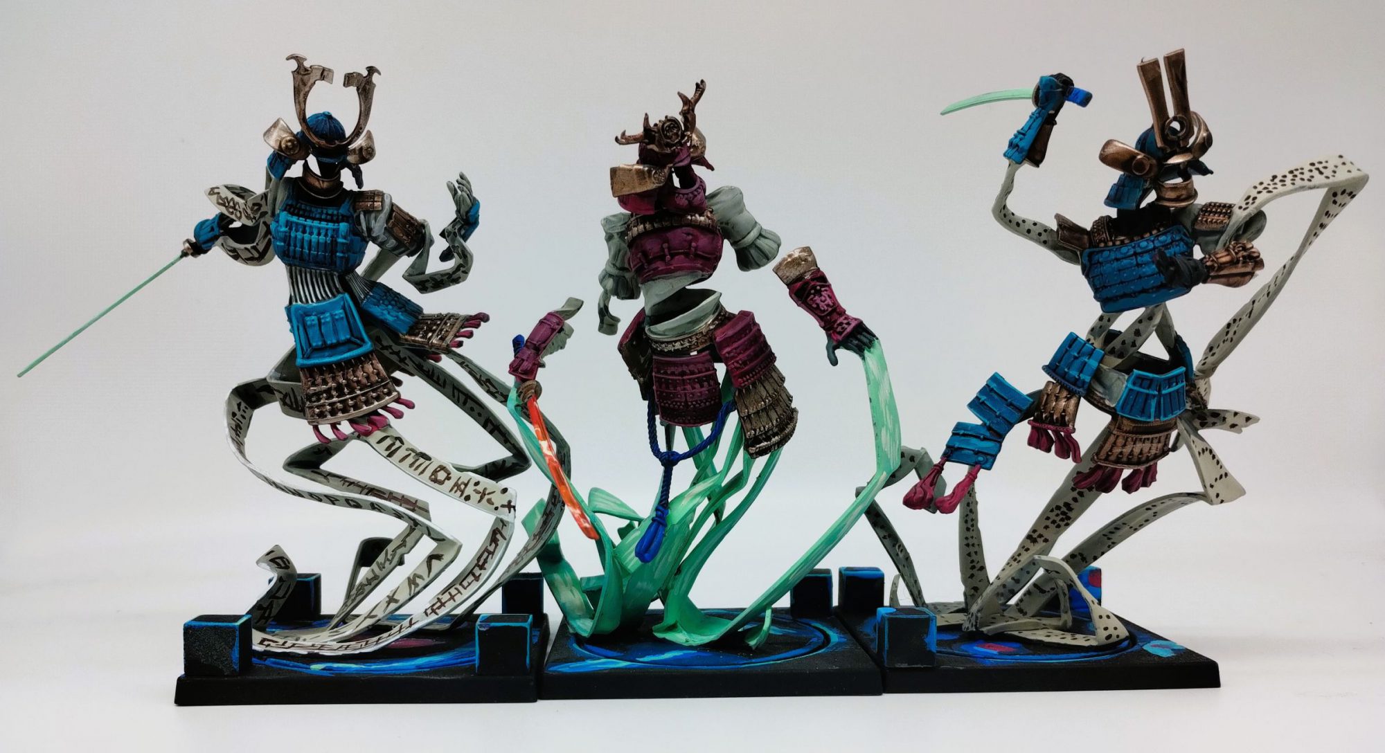 I’ve already said it, but just take a moment to appreciate the way these things look. Each strip of paper, twisting and folding over one another to create the illusion of arms and armour levitating above the ground. Without needing to read the blurb this spirit-infused, dynamically-posed collection of models communicates what it is visually. Incredible.