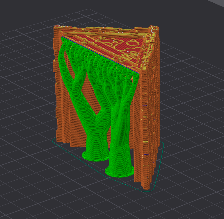 You can see even with supports just touching the build plate we still have a large number of trees supporting very small tile edges. By placing support blockers so that they fully enclose the tiles these can be prevented, saving us time and material.