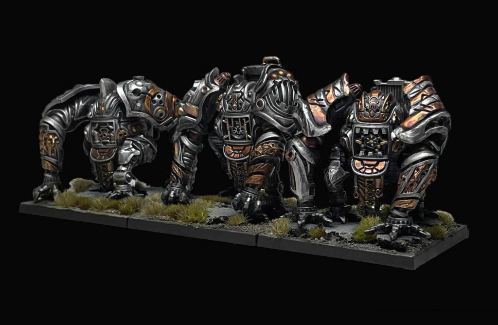 Credit @longbeardminis on InstagramA mainstay regiment in Tempered Sorcerer and Steelshaper warbands (and a restricted regiment in Hold Raegh warbands), Fireforged are a simple, efficient, deadly unit. They’re wet noodles in melee, but they’re very durable, and their ranged attacks are extremely powerful. Their range is on the lower side at only 14”, but with Armor Piercing 2 and Barrage 4, they can put out a lot of damage if given the chance to aim and fire. For additional damage they can also be given a Flamecaster to give them the Torrential Fire rule, but given the challenges of moving them within 7”, I generally prefer to keep the unit cheap.
