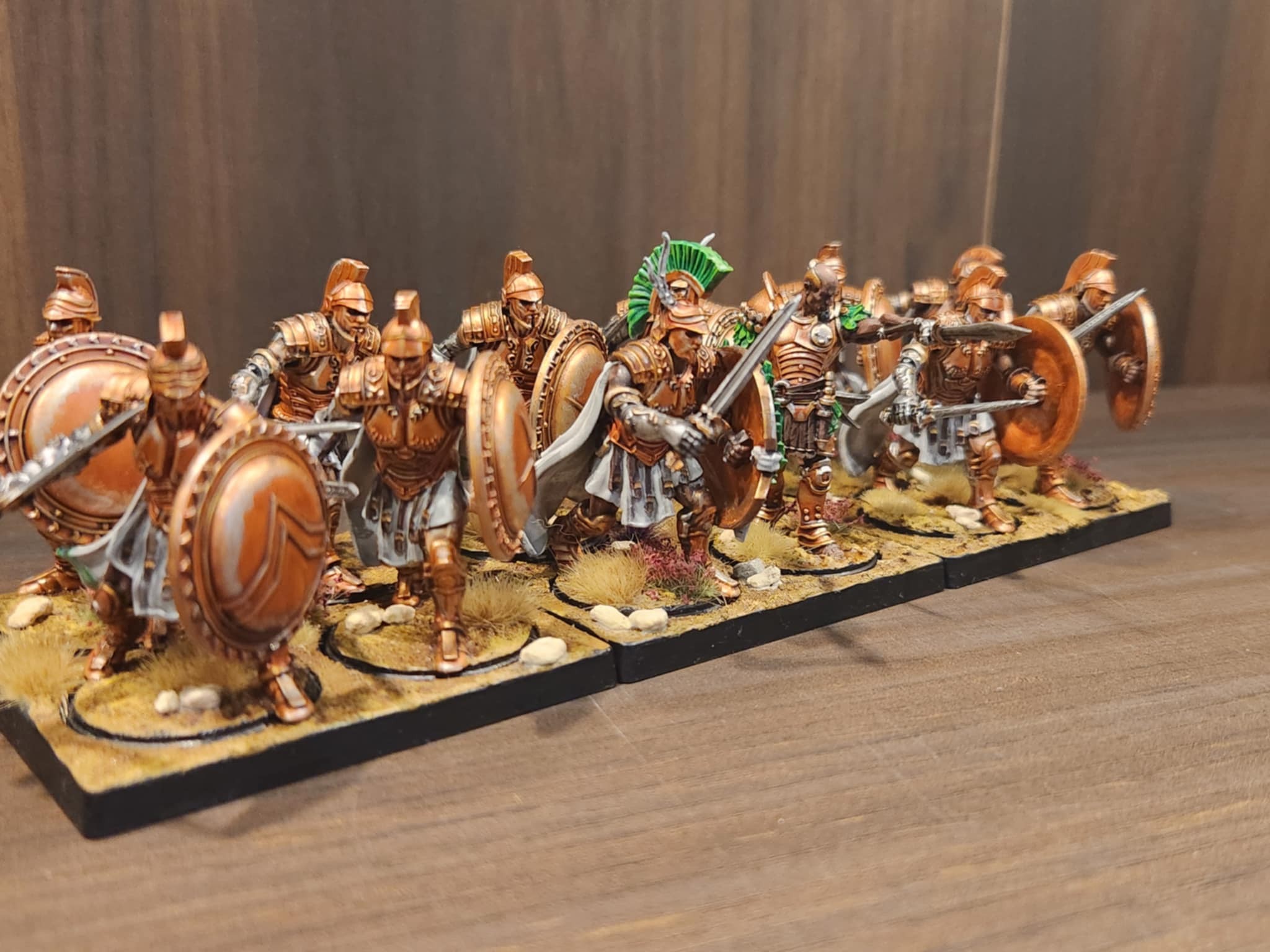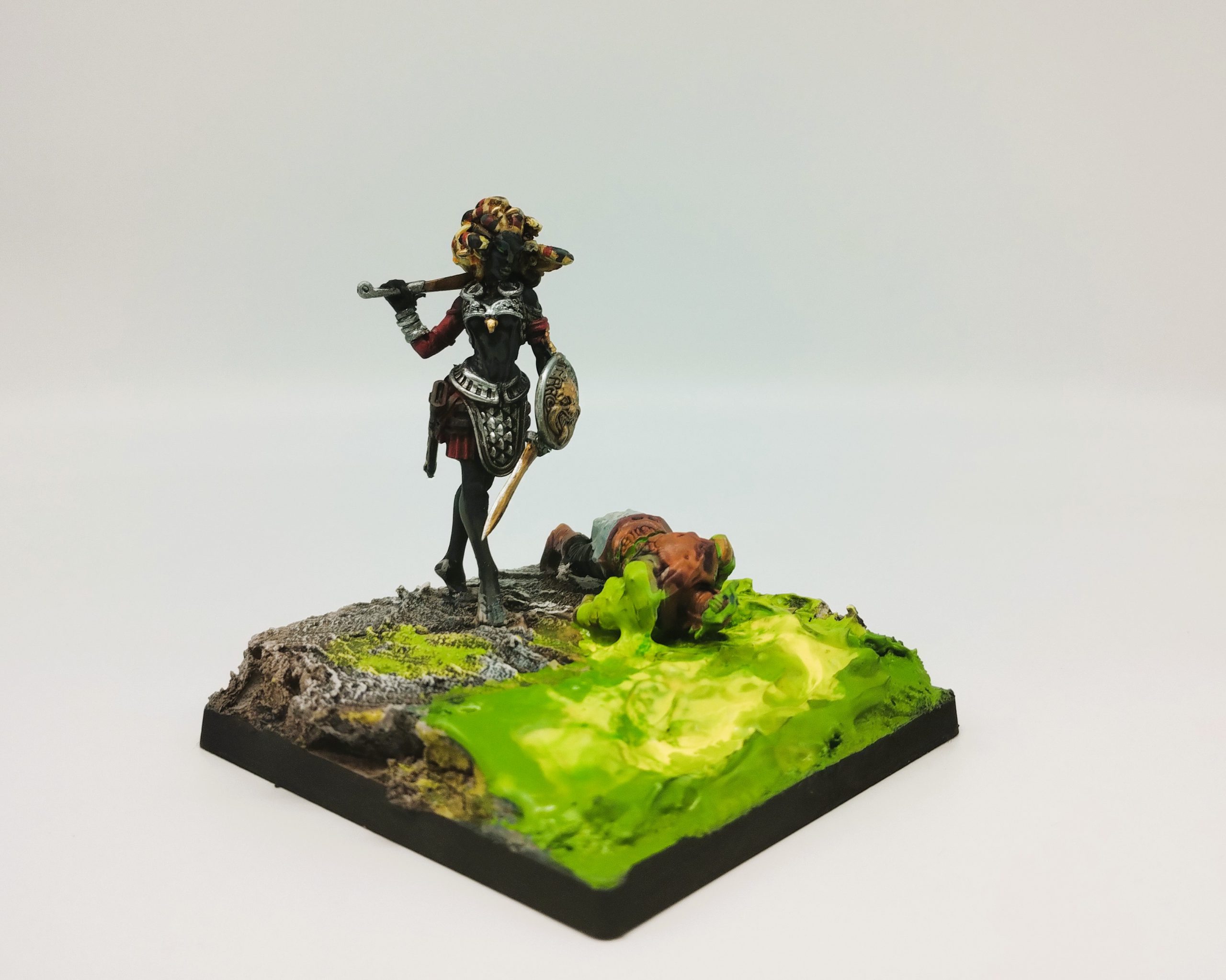 As far as the model herself goes, I can't help but get the impression she skipped leg day. She's got an absolutely ripped six pack but all of her limbs are extremely slender. It works for the effect, she feels kind of twisted and alien. Given her stance and light armour, though, she doesn't look at home amidst a unit of hoplites, though she'd fight right in with some Agema.