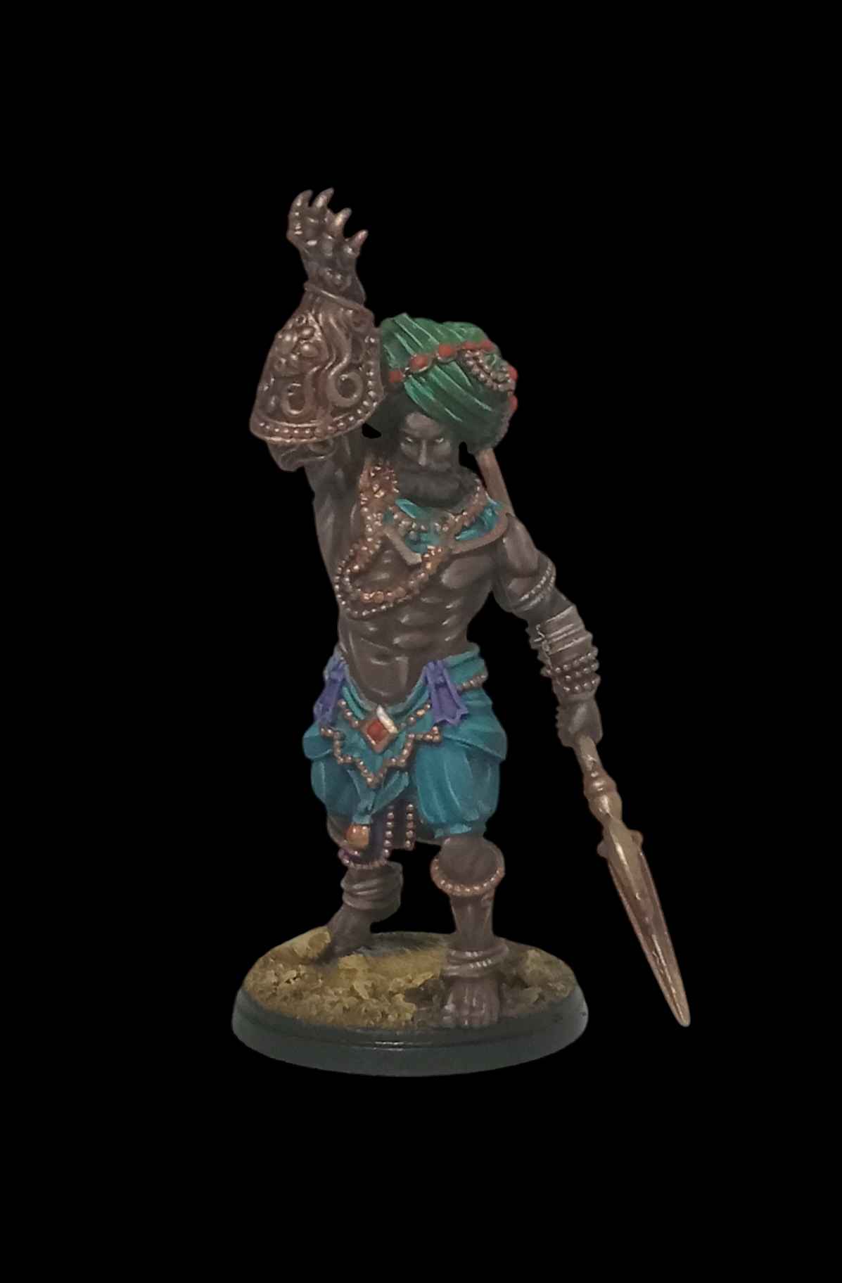 Some people like their wizards to be weedy, pale nerds who negotiate with the elements. I like my wizards to be buff, so jacked that even Gods, spirits and djinn bow to them in deference: Djacked, even. This sculpt is great, Yindak is here to make gains and gank monsters (and he’s all outta gains). The posing is quite dramatic, Yinbdak throwing an arm in the air as he summons or perhaps commands his elemental forces, the way his jewellery is sculpted helps communicate the motion of his gesture. The detail is, as ever with PB resin, gorgeous with lots of easily dry-brushed or washed sections. Despite the apparent detail and complexity of the model he’s very easy to paint. Not including assembly or zenithal undercoat, painting him took 2-3 hours and he looks pretty rad if you ask me (zenithal, contrast, highlight is the only way you’ll convince me to paint a rank-n-flank army these days). The musculature is a joy to work with, there’s enough definition in there that it’s easy to make Yindak look positively Süleymanoğlu-esque (google that one).