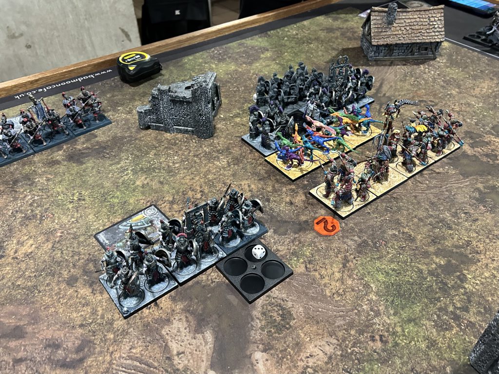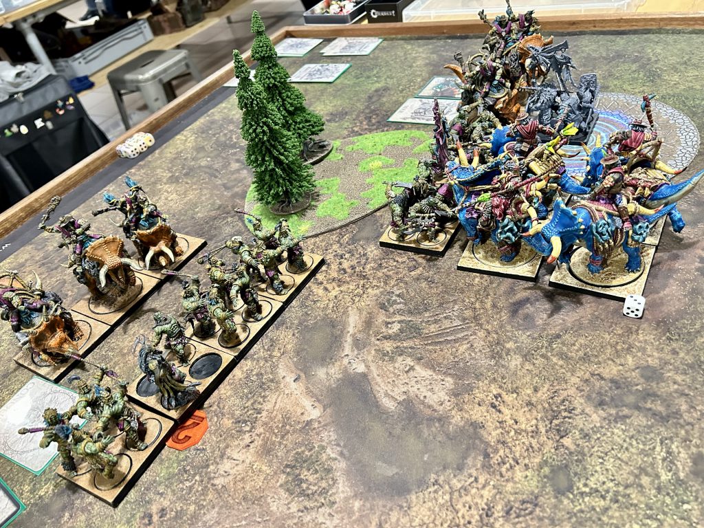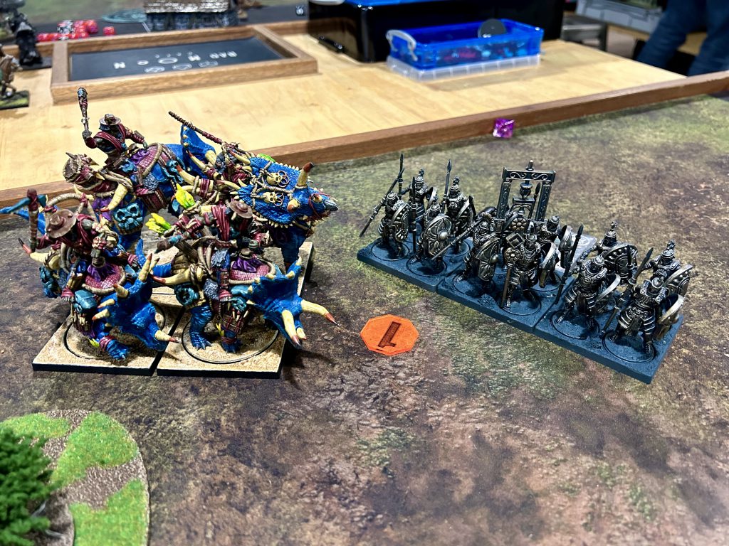 The early game saw Rob punch up aggressively with his Hunters and Hunting Pack, countered by my Slingers. Some devastating early shooting from the Slingers removed both over the next two turns however, allowing my Braves to charge up the right flank and my Blooded to face off against his Braves on the left. The Thunder Riders cleared out the Blooded with ease, but were countered by a frontal and flank charge from my own Thunder Riders to control the left zone. The Apex charged the flank of my Braves, but didn’t have the weight of attacks to clear through such a big unit. The Tontor was semi-paralyzed on the back 6” objective to remain control of some scoring, but eventually went after the Braves to clear them up alongside the Apex. We stopped at Turn 6 as I needed to prepare for the end of event, but my W’adrhun had secured too significant a scenario lead to be overcome with just two unts left.