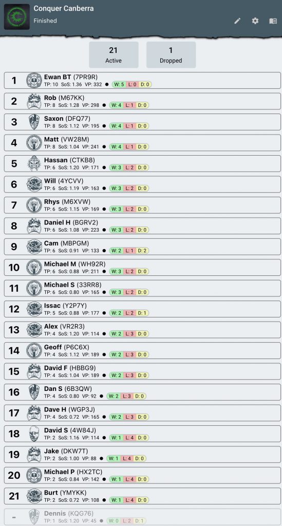Conquer Canberra PlacementsThat’s a great mix of factions and placements, with a full six different factions in the top six positions. My rounds two and three opponents Matt and Hassan made it to 4th and 5th place respectively, and Ewan’s round four opponent Saxon made it to 3rd with his Hundred Kingdoms. That’s an outstanding amount of variety, and reflective of a really dynamic broader meta-game. As a reminder, if you’re interested in the lists you can see all of them in my style="font-weight: 400;">video about them, or view them directly on the event list page.