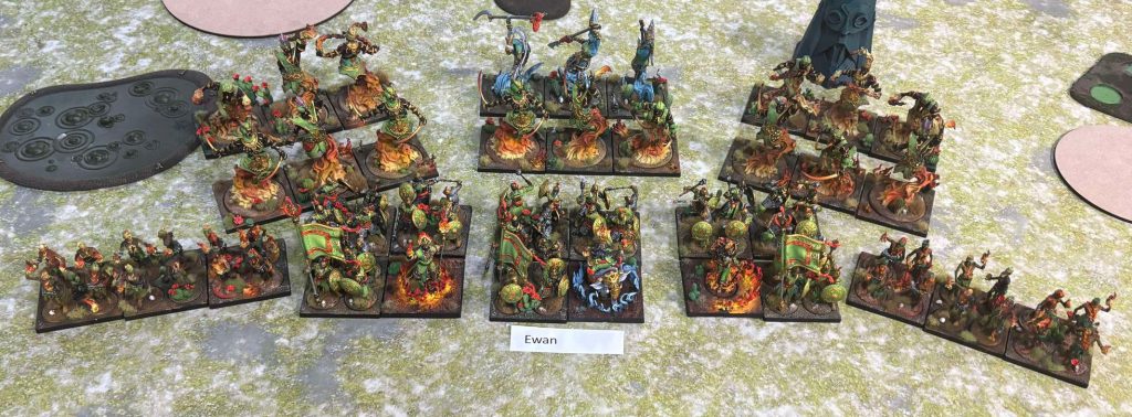 Ewan played the game incredibly tightly, knew exactly what he needed to do to pursue the narrow path to victory that was open to him, and did it. With a couple of actual nights’ sleep under my belt since the event, I can talk now about my own theory of victory and how I might barely have been able to recover the game, but in the moment, for all that I (technically) hadn’t lost a single regiment and Ewan’s army was backed into a desperate pocket, dying by inches to stall for time, I can confidently say that at the time there was no way I’d have had the mental resources left to chart my own course back into the game even if we’d had the extra hour we’d have needed to finish the game. The win was firmly Ewan’s, was reflective of the thought and care he’d put into preparing for and playing the game, and was extremely well deserved.