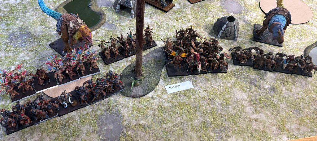 Geoff had a very clear game plan this game, which came very close to working. His Haspists contested the large objective zone in Head to Head, and he kept his Satyroi off the table until round three to force me to maintain defensive formations on the edge of the table, like so: