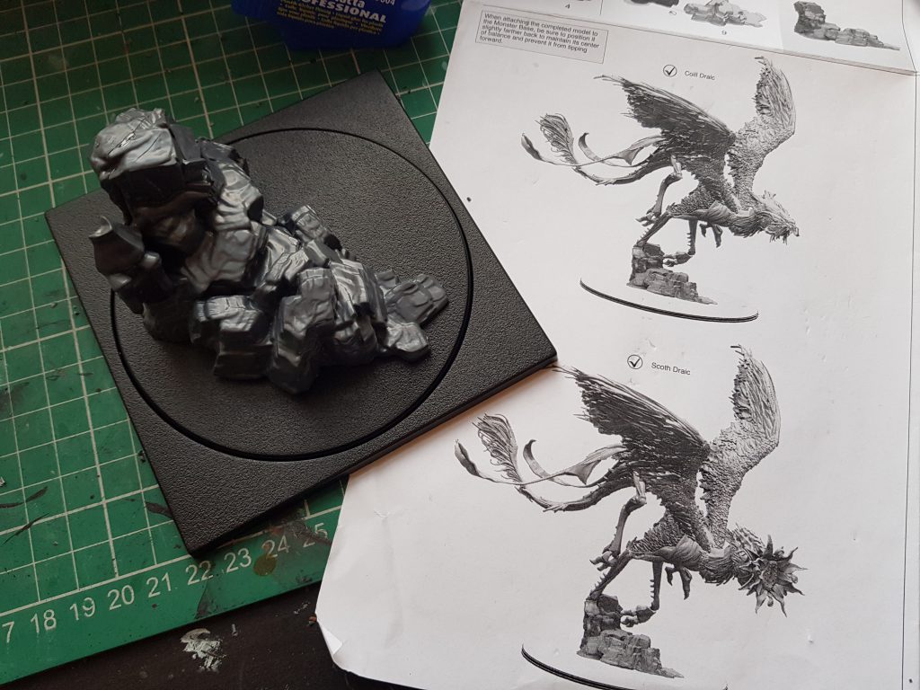 The assembled base. As advised on the instruction sheet, I glued some coins under the rocks. I followed this up later with some DAS clay surrounding the rocks, for even more ballast. Side note: It's very funny to me that the base shown in the instructional renders is about double the size of the actual one, which is far too small.Mostly the instructions are okay. There are some bits where they could have been clearer, for example attaching the rear wings to the body. I did figure it out eventually, but even the extra images included on the additional instruction sheet did not make it easy.