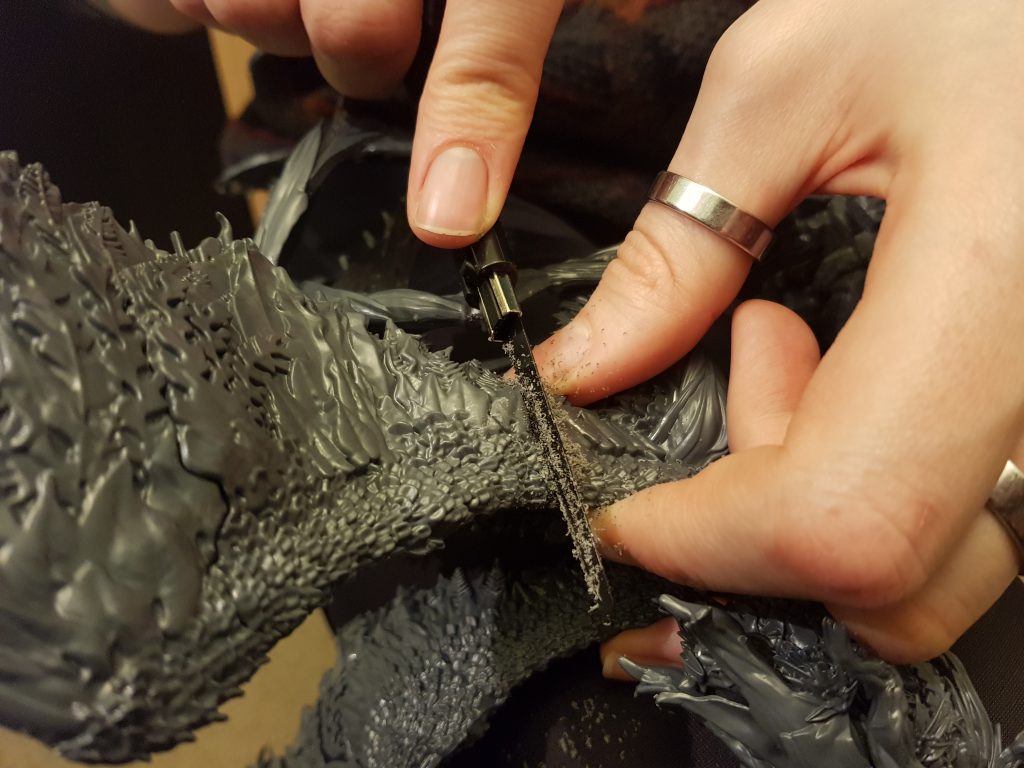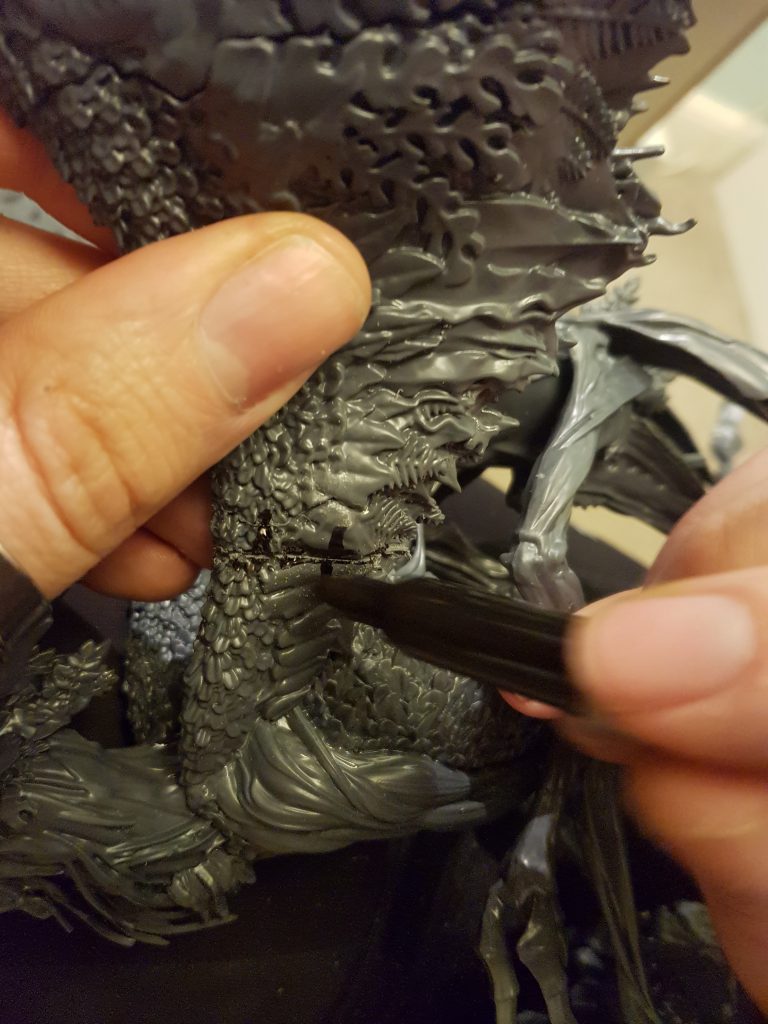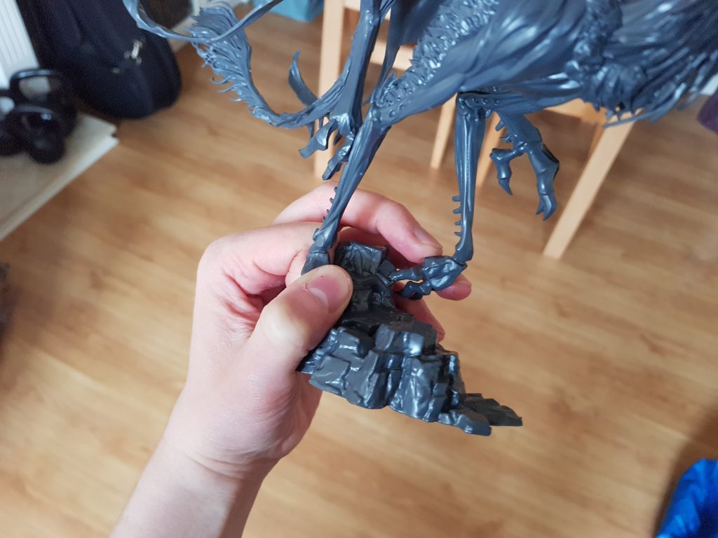 Problem 2: Yes, to the maker's credit, it may just about stand up for itself using those tiny contact points on a weighted-down base -- but the moment you inevitably knock it over it will snap at exactly the point you expect it to, just above the ankle. At which point you will have to do a repair, and the repair will never be good enough to allow the dragon to stand unassisted, so before you break your dragon you may as well just add some extra support in the form of a third contact point with the base, closer to the center of mass, anyway.