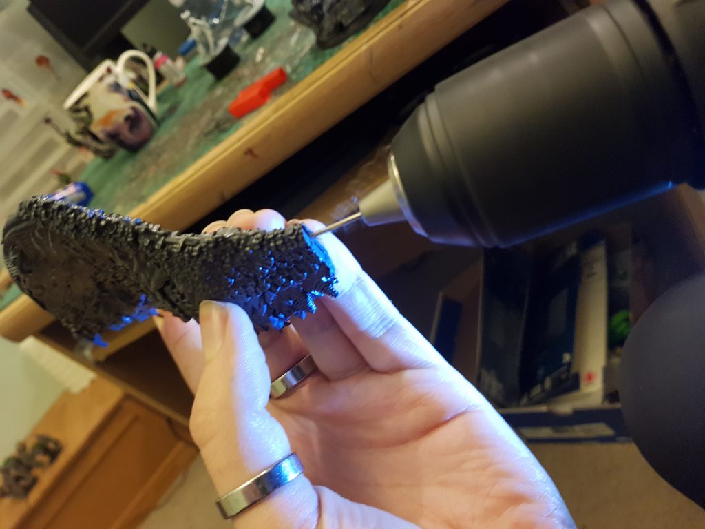 Like so. In fact there is a little groove in the middle of the Draic's chest that means you will not even have to drill a hole for the rod to embed into.If you look closely at my Draic's right leg you can see the point above the ankle where I had to do a difficult repair.