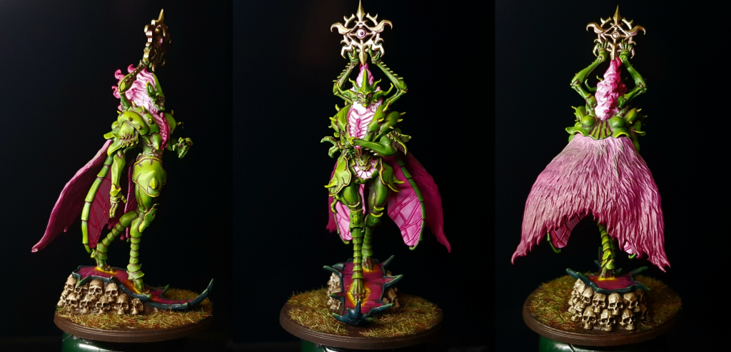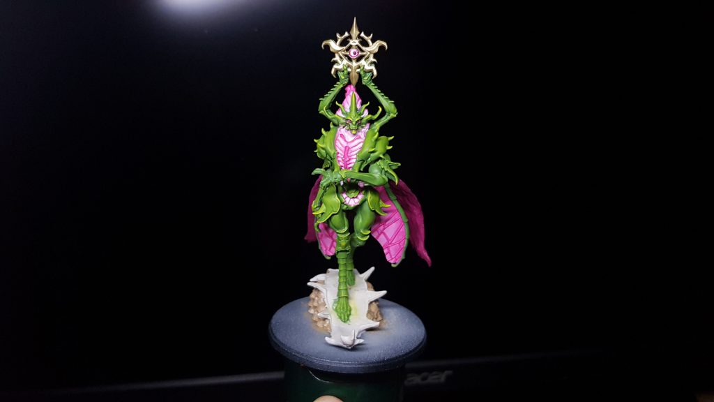 Red in the recess. Credit: RachelFor the base, I stole the box art’s idea of having the plant-tongue-thing he’s stepping on be bioluminescent around his feet. I painted the rest Violet Red and the green bits Citadel Incubi Darkness, highlighted with Warboss Green, for a much colder green than Oberon’s carapace. The skulls were Citadel Zandri Dust, washed with Citadel Agrax Earthshade. The rest of the base was given a coat of Citadel Rhinox Hide and a little static grass.