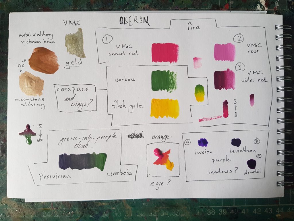 The box art for this guy is stunning but not the kind of thing I’d be tempted to replicate. Instead I set about scheming for something reasonably quick, simple and easy to read. I pondered plants, bugs, and other things in nature. I thought about fairies, in particular the old stories to which this Oberon owes his name, browsing through paintings of scenes from A Midsummer Night’s Dream and other fairytales. I looked at costume designs for the Shakespeare play. In some he wears black rags, in contrast to Queen Titania; in others he is among the most fantastically garbed of the cast. I was particularly taken by C. Wilhelm’s design for him: vibrant green with blue shadows and purple accents.What followed was some on-paper probing: