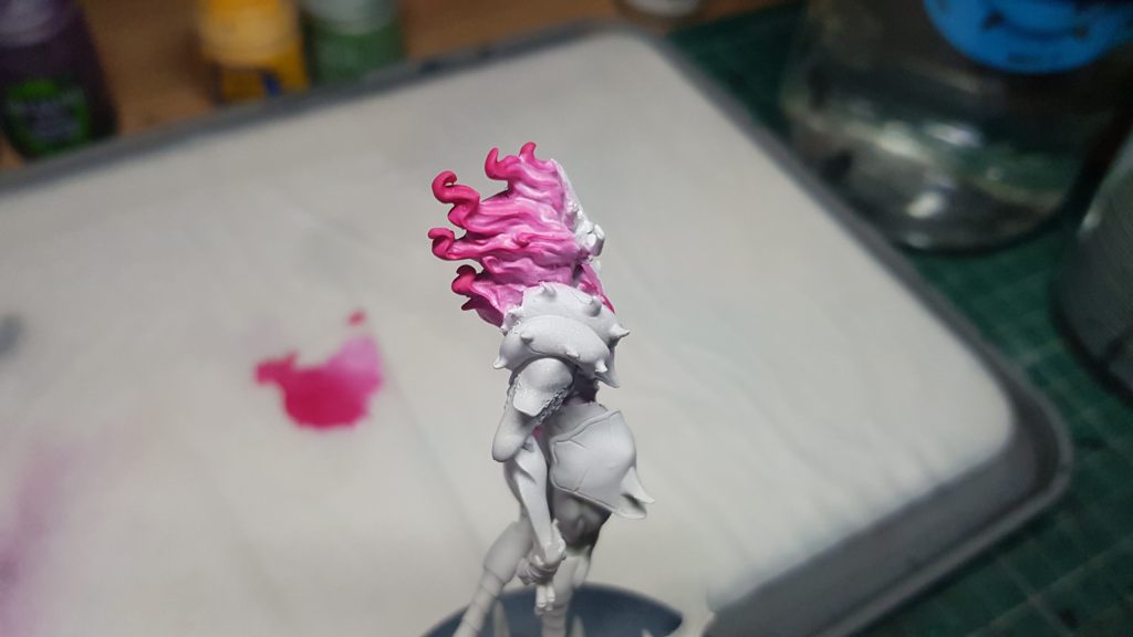 Pink flames. Credit: RachelWith the brushbrush I started on the flame, mixing Vallejo Model Color (VMC) Sunset Red with white. Painting fire is always fun. It could have been fiddly for the brush to get where it was needed, but my decision to use subassemblies paid dividends here.