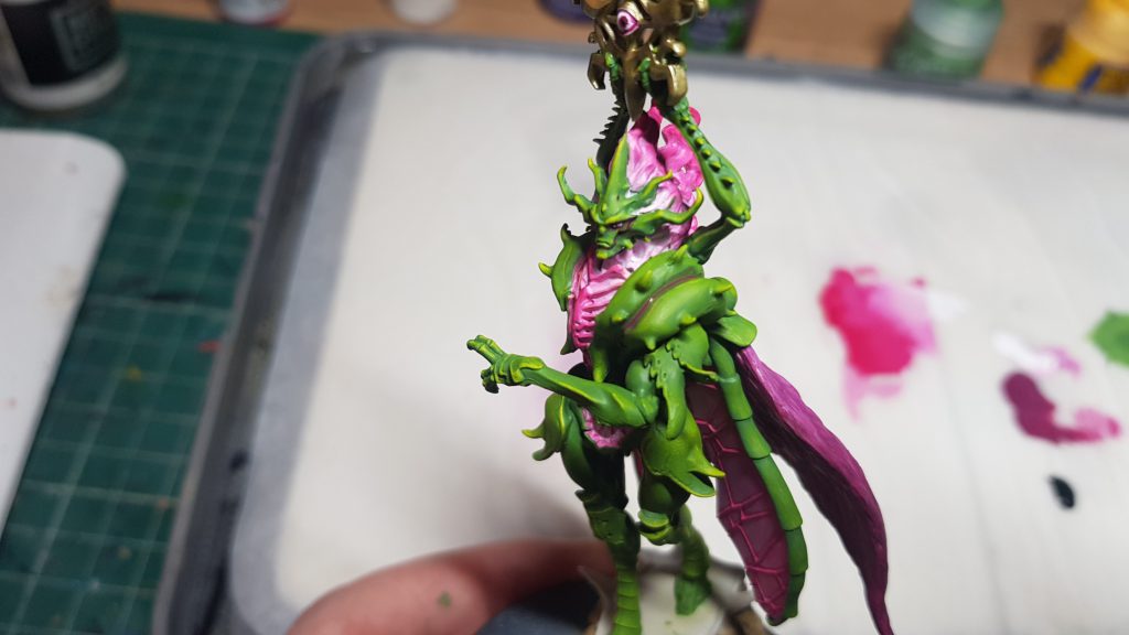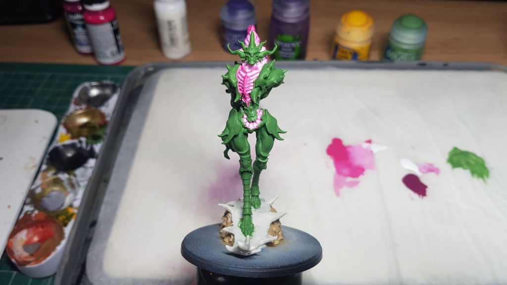 With the model assembled, I upped the contrast on the carapace by running Violet Red into the recesses. I should have used a better paint medium for this, as using water resulted in tide marks, most of which I couldn’t be bothered to clean up.