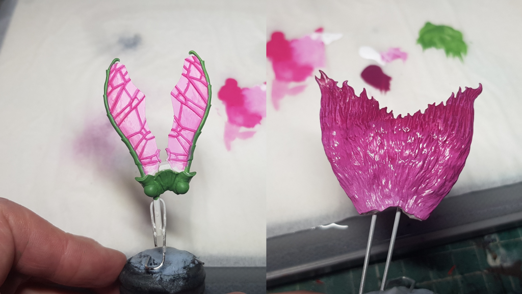 WIP of Oberon's wings, left, and cape, right. Credit: RachelFor the wing membranes I wasn’t sure what direction to go in, so I slapped down some of the same pink and, realising it would look ok, committed to it. In a similar vein I tried VMC Violet Red (a deeper, darker purple than Sunset Red) on his cape and wet-blended it with white. I would later come in with a green drybrush to help marry it to his carapace.