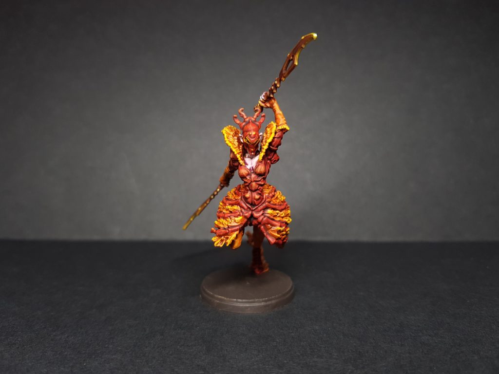 The champion has a fancier helmet, armoured vambraces and more ornate swords. Notice the unfortunate detail mush on the skirt. Credit: RachelI was going for speed, not precision, so I was happy to find that while the details were a little bit mushy in some places (for example in the leaves of the skirt and especially wherever they meet the insectoid legs that spread across it), the models took Contrast paint and drybrushing well.