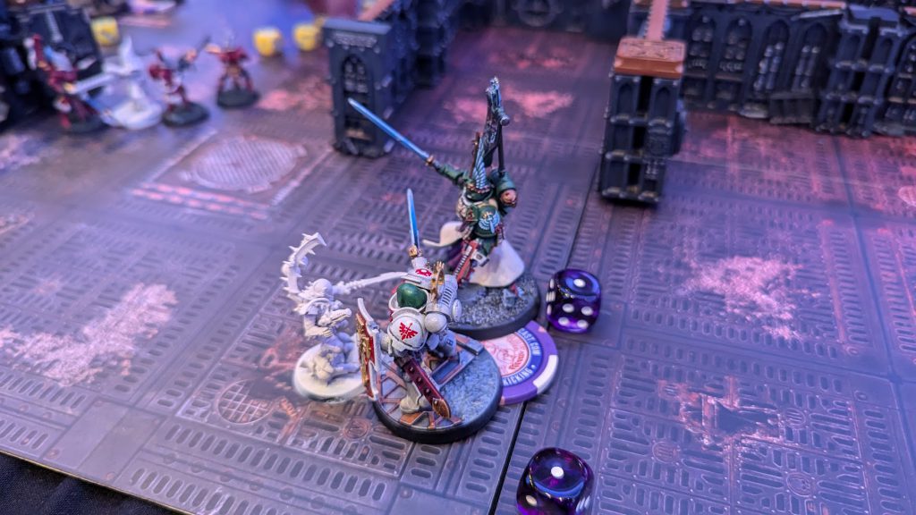 The Dark Angels and Rainbow Warriors are going at it, based on confusion as to whom betrayed whom! Credit: Kevin StillmanThis game would prove the exact opposite of the Friday night narrative game - it was fun, thrilling, balanced, ridiculous, featured epic cinematic moments, and was played with people who were there to drink beer (including as I would learn the next day, the last of the NoVa exclusive beer), throw dice, and have fun. Playing Dark Angels and Azrael, my Gregbot dice *finally* started to roll saving throws. Funny, that.