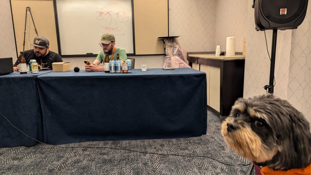 Campbell and Dan give an extremely bored Salsa pets. Credit: Kevin Stillman, but also to Campbell and Dan for being mensches with a bored ShihPoo.The NoVa Open 2024 Warhammer Preview has almost certainly been discussed in depth and ad nauseum by this point. It is a disappointment from the legendary high water mark of NoVa Open previews (the 2018 Preview where everyone in attendance received a pre-release Sisters of Battle Cannoness), and the "NoVA Exclusive" portions of the panel are 1) Trivia (Goonhammer's Neon Goblin takes second place in the AOS trivia round), and 2) an in-depth discussion of the 2024 Grand Narrative setting because Chris Stover was taking an active hand in shaping that Narrative and NoVa is his home convention. Salsa herself found the entire thing to be extremely boring. So after the preview ends, most folks wander over to the Badcast live taping. Salsa and I head over to the bar, to find Norm and Condit. After chatting and wandering for a bit, where Salsa helps herself to as many cuddles from as many new people as possible, we hit the Badcast live show.