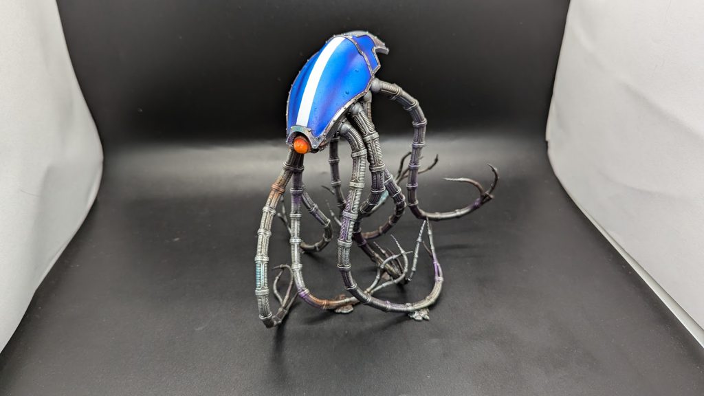 After a nice, refreshing workout, I went to my class of the day: Knightmare Chrome taught by Dan Ozborne. This was an airbrush class where we would paint a "Knight Sized" model in about six hours. The model was a 3D print of a nifty robotic Octopus with something akin to a carapace plate to practice stencil use and liquid masking techniques. Dan also taught us his method of painting metallics - which was similar to but ever-so-slightly different than the ones I had learned from previous NoVas (prime black, airbrush translucent brown, then do an overbrush of bronze, a drybrush of a bronze-silver mix, and then a silver final highlight drybrush). The difference for this one was to make use of the shadows and paint them progressively: brown, purple, and then ProAcryl Payne's Grey. This produces something a bit similar to a heat bloom effect, which looks pretty neat.